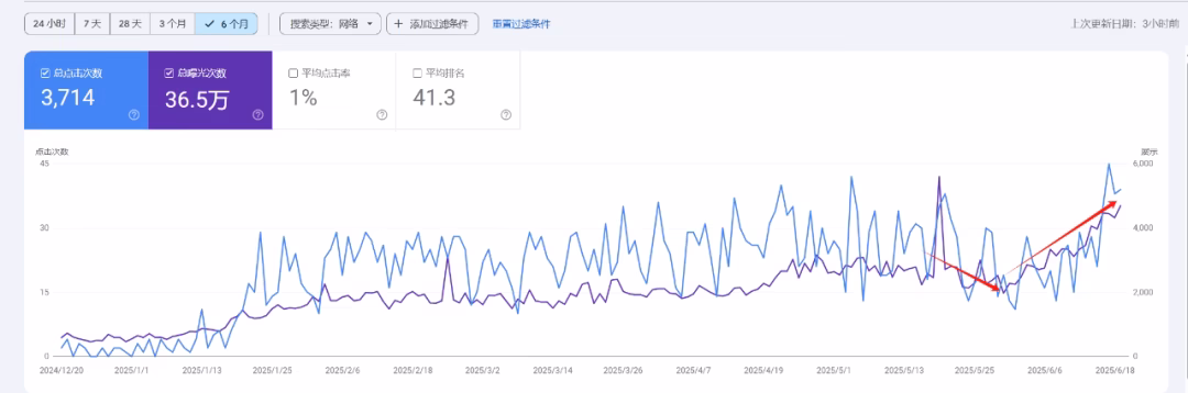 从上图可以清楚地看到,在我进行“内容修剪”之后,网站的总展示量和点击量,一改颓势,开始了一波非常健康的持续上涨。